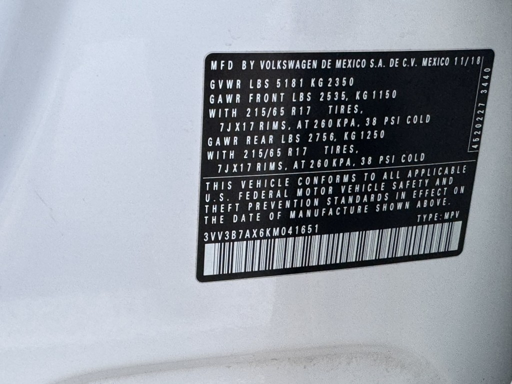 | VIN #: | 3VV3B7AX6KM041651 |