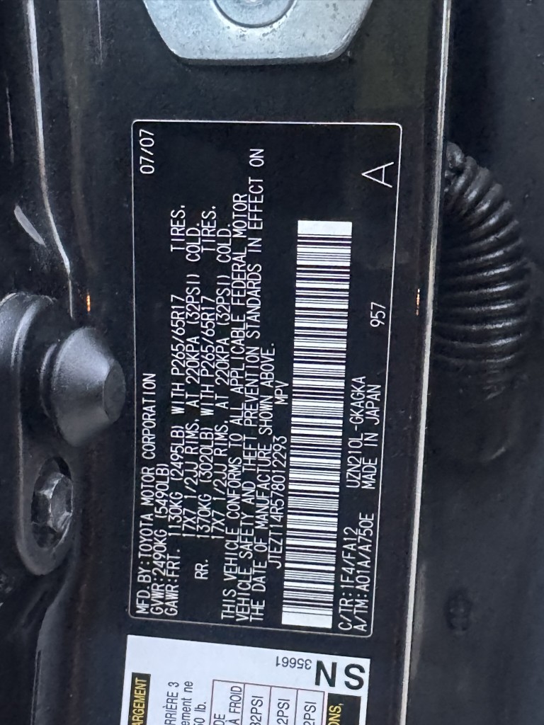 | VIN #: | JTEZT14R578012293 |